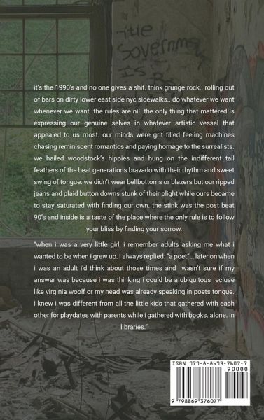 it's the 1990's and no one gives a shit. think grunge rock.. rolling out of bars on dirty lower east side nyc sidewalks.. do whatever we want whenever we want. the rules are nil. the only thing that mattered is expressing our genuine selves in whatever artistic vessel that appealed to us most. our minds were grit filled feeling machines chasing reminiscent romantics and paying homage to the surrealists. we hailed woodstock's hippies and hung on the indifferent tail feathers of the beat generations bravado with their rhythm and sweet swing of tongue. we didn't wear bellbottoms or blazers but our ripped jeans and plaid button downs stunk of their plight while ours became to stay saturated with finding our own. the stink was the post beat 90's and inside is a taste of the place where the only rule is to follow your bliss by finding your sorrow. when i was a very little girl, i remember adults asking me what i wanted to be when i grew up. i always replied: "a poet"... later on when i was an adult I'd think about those times and wasn't sure if my answer was because i was thinking i could be a ubiquitous recluse like virginia woolf or my head was already speaking in poets tongue. i knew i was different from all the little kids that gathered with each other for playdates with parents while i gathered with books. alone. in libraries."