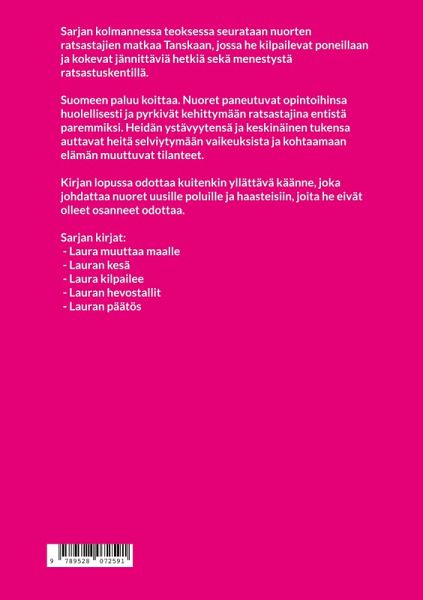 Sarjan kolmannessa teoksessa seurataan nuorten ratsastajien matkaa Tanskaan, jossa he kilpailevat poneillaan ja kokevat jännittäviä hetkiä sekä menestystä ratsastuskentillä. Suomeen paluu koittaa. Nuoret paneutuvat opintoihinsa huolellisesti ja pyrkivät kehittymään ratsastajina entistä paremmiksi. Heidän ystävyytensä ja keskinäinen tukensa auttavat heitä selviytymään vaikeuksista ja kohtaamaan elämän muuttuvat tilanteet. Kirjan lopussa odottaa kuitenkin yllättävä käänne, joka johdattaa nuoret uusille poluille ja haasteisiin, joita he eivät olleet osanneet odottaa. Sarjan kirjat: - Laura muuttaa maalle - Lauran kesä - Laura kilpailee - Lauran hevostallit - Lauran päätös Tulossa: - Eläinlääkäri Laura - Kilparatsastaja Laura