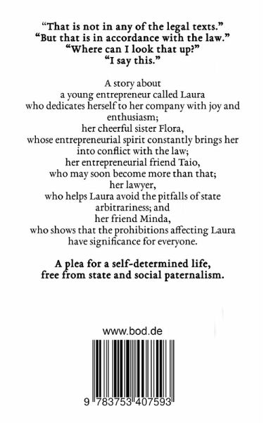 A story about a young entrepreneur called Laura who dedicates herself to her company with joy and enthusiasm;her cheerful sister Flora, whose entrepreneurial spirit constantly brings her into conflict with the law;her entrepreneurial friend Taio, who may soon become more than that;her lawyer, who helps Laura avoid the pitfalls of state arbitrariness; andher friend Minda, who shows that the prohibitions affecting Laura have significance for everyone.A story that shows, that only free market economy and personal freedom enable the release of creative abilities and the voluntary cooperation of people for the benefit of all. A plea for a self-determined life, free from state and social paternalism.