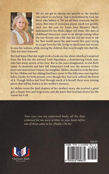 We do not get to choose our parents or the families into which we are born. That is predestined by God, for those who believe it. We are all born innocent, but for many, that time of innocence passes much too quickly. Such was the case for Laura Faye Flannery (Red), nicknamed for her thick copper red mane. Her days of childhood innocence came to an abrupt ending when she was thrown into a life that she did not want or ask for. Red would spend the next twenty-five years trying to escape from her life, living on daydreams and secrets to ease her sadness, while raising the children that were brought into that life. They too were innocent. Red had hoped that she might write a book one day about what had transpired from the first day she married Louk Papadakas, a domineering Greek man, who had many secrets of his own. But as the years disappeared, so did Red's mind. As dementia and later full Alzheimer's took over the memory of this brave and determined woman, her daughter, Melina, decided to write the story for her. Melina and her siblings had been raised in this fallacious marriage but held a loyalty for both parents, even though they had each suffered the brunt of it. Though Melina had lived through much of it herself, there were missing pieces that still lay hidden in her mother's memory. As Melina wrote the final chapters of her mother's story, she received a great gift, a deeper love and forgiveness, and she knew that God had shown her the reason for it all. Your eyes saw my unformed body; all the days ordained for me were written in your book before one of them came to be. (Psalm 139:16)