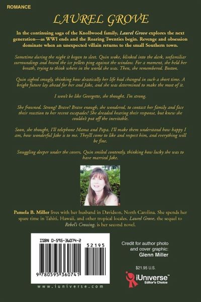 In Laurel Grove, the sequel to Rebel's Crossing, the lives of the next generation of the Knollwood family are changed forever as sins of the past sweep through the placid Southern town. Vince Knollwood, the stable, responsible heir discovers love-but family conflict and a brother's jealousy jeopardize his happiness. Can he shoulder the burdens of his errant kin and still be with the woman he loves? Kate Knollwood's pledge to David Overby can't stop her growing dependence and love for Art Wheeler. A reckoning is inevitable, and Kate must cope with a nightmare of a marriage and the tragic death of a man she loves. After the impetuous, spoiled Quin Knollwood elopes, she is shocked to learn her new husband isn't the man she thought. The final revelation will shatter the careless young girl's self-assurance. Will the Knollwood family survive the vengeance that stalks the town from all sides?
