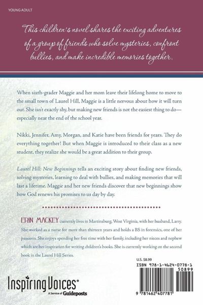 When sixth-grader Maggie and her mom leave their lifelong home to move to the small town of Laurel Hill, Maggie is a little nervous about how it will turn out. She isn't exactly shy, but making new friends is not the easiest thing to do-especially near the end of the school year. Nikki, Jennifer, Amy, Morgan, and Katie have been friends for years. They do everything together! But when Maggie is introduced to their class as a new student, they realize she would be a great addition to their group. Laurel Hill: New Beginnings tells an exciting story about finding new friends, solving mysteries, learning to deal with bullies, and making memories that will last a lifetime. Maggie and her new friends discover that new beginnings show how God renews his promises to us day by day.