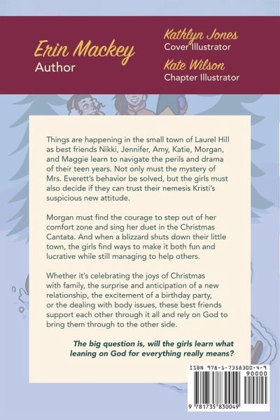 Things are happening in the small town of Laurel Hill as best friends Nikki, Jennifer, Amy, Katie, Morgan, and Maggie learn to navigate the perils and drama of their teen years. Not only is the mystery of Mrs. Everett's behavior solved, but the girls must decide if they can trust their nemesis Kristi's new attitude. Morgan must find the courage to step out of her comfort zone and sing her duet in the Christmas Cantata. And when a blizzard shuts down their little town, the girls find ways to make it both fun and lucrative while still managing to help others. Whether it's celebrating the joys of Christmas with family, the surprise and anticipation of a new relationship, the excitement of a birthday party, or the dealing with body issues, these best friends support each other through it all and rely on God to bring them through to the other side. The big question is, will the girls learn what leaning on God for everything really means?