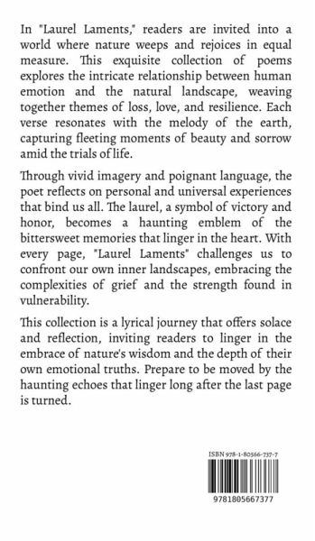 In "Laurel Laments," readers are invited into a world where nature weeps and rejoices in equal measure. This exquisite collection of poems explores the intricate relationship between human emotion and the natural landscape, weaving together themes of loss, love, and resilience. Each verse resonates with the melody of the earth, capturing fleeting moments of beauty and sorrow amid the trials of life. Through vivid imagery and poignant language, the poet reflects on personal and universal experiences that bind us all. The laurel, a symbol of victory and honor, becomes a haunting emblem of the bittersweet memories that linger in the heart. With every page, "Laurel Laments" challenges us to confront our own inner landscapes, embracing the complexities of grief and the strength found in vulnerability. This collection is a lyrical journey that offers solace and reflection, inviting readers to linger in the embrace of nature's wisdom and the depth of their own emotional truths. Prepare to be moved by the haunting echoes that linger long after the last page is turned.