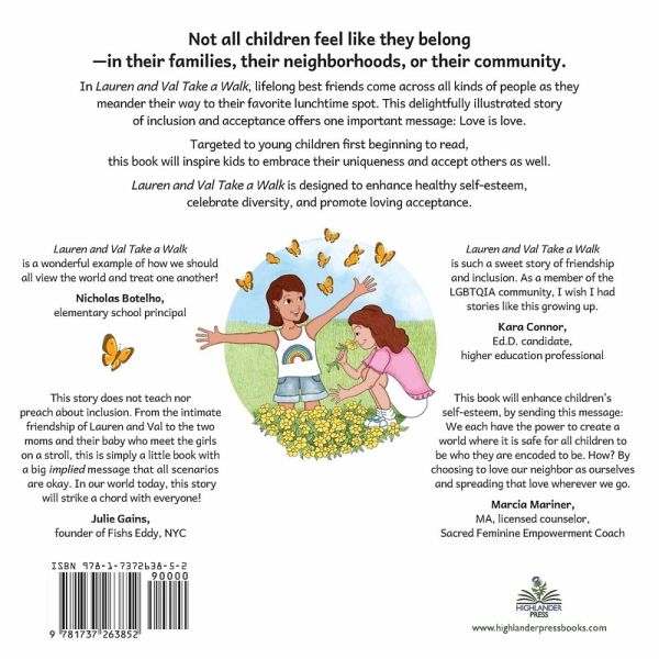 Not all children feel like they belong-in their families, their neighborhoods, or their community. In Lauren and Val Take a Walk, lifelong best friends come across all kinds of people as they meander their way to their favorite lunchtime spot. This delightfully illustrated story of inclusion and acceptance offers one important message: Love is love. Targeted to young children first beginning to read, this book will inspire kids to embrace their uniqueness and accept others as well. Lauren and Val Take a Walk is designed to enhance healthy self-esteem, celebrate diversity, and promote loving acceptance.