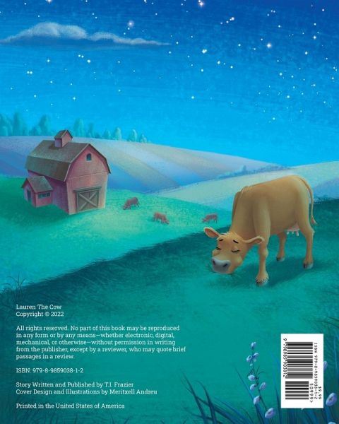 Taking place in the countryside, Lauren is a Jersey cow (calf) who is determined to be a jumping cow when she grows up. She has to work hard and train if she is going to accomplish her dream. In the end, she doesn't just jump but discovers she can fly. This story teaches children to believe in themselves and to try new things even if it has never been done before. It encourages the spirit of exploring yourself and to push beyond what you think is possible.