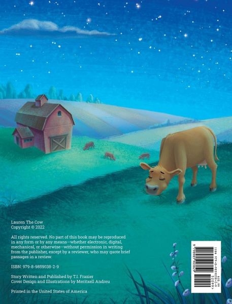 Taking place in the countryside, Lauren is a Jersey cow (calf) who is determined to be a jumping cow when she grows up. She has to work hard and train if she is going to accomplish her dream. In the end, she doesn't just jump but discovers she can fly. This story teaches children to believe in themselves and to try new things even if it has never been done before. It encourages the spirit of exploring yourself and to push beyond what you think is possible.