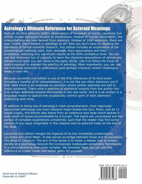 The original dictionary of rarely-researched asteroids is now bigger, better, and backed by heavy statistical analysis. Laurentia 2nd edition includes improved interpretations and objective metrics for astrology students, researchers, and skeptics alike, enabling everyone to follow their curiosity into a field once popularly considered untestable. Now, in the age of AI, we know that even the fuzziest processes are testable and simulatable. Astrology is no different. This second edition of Laurentia excludes the complex theory chapters from the first edition, and now consists of three major parts: a short methodology section, the main dictionary, and an all new nearly 200-page index which the reader can use to look up which asteroids are most associated with their topic of choice. On that note... The definitions in this reference are derived from text analysis of an extensive dictionary of over 20,000 words from over 40,000 charts, some of which involve potentially offensive topics ranging from sex, money and politics to mass shootings and drug use. This isn't the fluffy astrology one might expect, but goes everywhere an internet dictionary would be expected to go. What results is a reference for readers who want to know as much as there is to know about the astro factors covering any topic, where there is likely a body for any subject you can think of.