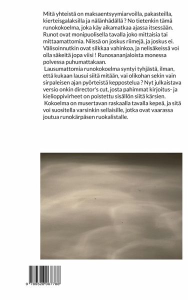 Mitä yhteistä on maksaentsyymiarvoilla, pakasteilla, kierteisgalaksilla ja nälänhädällä ? No tietenkin tämä runokokoelma, joka käy aikamatkaa ajassa itsessään. Runot ovat monipuolisella tavalla joko mittaisia tai mittaamattomia. Lausumattomia runokokoelma syntyi tyhjästä, ilman, että kukaan lausui siitä mitään, vai olikohan sekin vain sirpaleisen ajan pyörteistä keppostelua ? Kokoelma on musertavan raskaalla tavalla kepeä, ja sitä voi suositella varsinkin sellaisille, jotka ovat vaarassa joutua runokärpäsen ruokalistalle.
