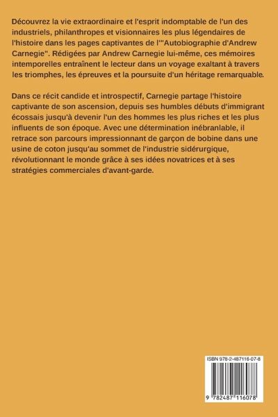 L' Autobiographie d'Andrew Carnegie ou un voyage de vision, de richesse et de philanthropie Découvrez la vie extraordinaire et l'esprit indomptable de l'un des industriels, philanthropes et visionnaires les plus légendaires de l'histoire dans les pages captivantes de l'"Autobiographie d'Andrew Carnegie". Rédigées par Andrew Carnegie lui-même, ces mémoires intemporelles entraînent le lecteur dans un voyage exaltant à travers les triomphes, les épreuves et la poursuite d'un héritage remarquable. Dans ce récit candide et introspectif, Carnegie partage l'histoire captivante de son ascension, depuis ses humbles débuts d'immigrant écossais jusqu'à devenir l'un des hommes les plus riches et les plus influents de son époque. Avec une détermination inébranlable, il retrace son parcours impressionnant de garçon de bobine dans une usine de coton jusqu'au sommet de l'industrie sidérurgique, révolutionnant le monde grâce à ses idées novatrices et à ses stratégies commerciales d'avant-garde. Au-delà de son succès monumental dans les affaires, l'autobiographie de Carnegie se penche sur sa transformation personnelle, alors qu'il est aux prises avec les questions profondes de la richesse, de la responsabilité et du but de la vie. Avec une franchise rafraîchissante, il examine les joies et les pièges de l'accumulation d'une grande fortune, tout en mettant en lumière l'impact profond qu'elle a eu sur ses valeurs personnelles et son engagement philanthropique. Au-delà de l'histoire fascinante d'un self-made-man, ce livre offre une sagesse pratique et des principes intemporels qui transcendent le temps et trouvent un écho auprès du public contemporain. La philosophie de Carnegie, qui considère la richesse comme un moyen d'élever la société, l'importance qu'il accorde à la coopération plutôt qu'à la compétition et son engagement permanent à rendre la pareille sont des leçons durables qui continuent d'inspirer les générations. Plongez dans la vie d'un véritable titan de l'industrie et de la philanthropie, et embarquez pour un voyage transformateur qui met en lumière le pouvoir de la vision, de l'ambition et de l'héritage durable de l'engagement inébranlable d'un homme à rendre le monde meilleur. L'histoire d'Andrew Carnegie est non seulement un témoignage du rêve américain, mais aussi une invitation à rêver plus grand, à viser plus haut et à laisser un impact durable sur le monde qui nous entoure. Un livre à lire !