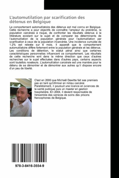 Le comportement automutilatoire des détenus est mal connu en Belgique. Cette recherche a pour objectifs de connaître l'ampleur du problème, la population carcérale à risque, de confronter les résultats obtenus à la littérature existant sur le sujet et de comparer les déterminants de l'automutilation de la population générale pour l'automutilation par scarification à ceux de la population incarcérée. Une incidence cumulée de 1.2% est relevée sur 6 mois. Il apparaît que le comportement automutilatoire diffère fortement entre la population générale et les détenus. Les conditions de détention, le statut pénal ainsi que certaines caractéristiques personnelles influencent ce comportement. Les résultats de cette recherche vont dans la même direction que ceux d'autres recherches sur le sujet effectuées dans d'autres pays, certains aspects sont toutefois novateurs. L'automutilation carcérale est une manière pour le détenu de se démontrer et de démontrer aux autres qu'il dispose encore d'un peu de liberté.