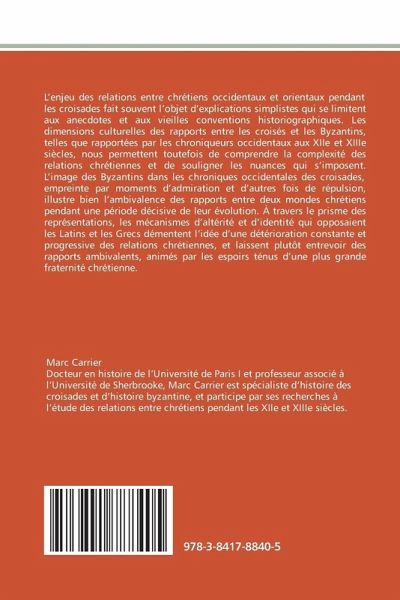 L enjeu des relations entre chrétiens occidentaux et orientaux pendant les croisades fait souvent l objet d explications simplistes qui se limitent aux anecdotes et aux vieilles conventions historiographiques. Les dimensions culturelles des rapports entre les croisés et les Byzantins, telles que rapportées par les chroniqueurs occidentaux aux XIIe et XIIIe siècles, nous permettent toutefois de comprendre la complexité des relations chrétiennes et de souligner les nuances qui s imposent. L image des Byzantins dans les chroniques occidentales des croisades, empreinte par moments d admiration et d autres fois de répulsion, illustre bien l ambivalence des rapports entre deux mondes chrétiens pendant une période décisive de leur évolution. À travers le prisme des représentations, les mécanismes d altérité et d identité qui opposaient les Latins et les Grecs démentent l idée d une détérioration constante et progressive des relations chrétiennes, et laissent plutôt entrevoir des rapports ambivalents, animés par les espoirs ténus d une plus grande fraternité chrétienne.