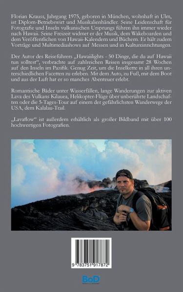 Der Autor des Reiseführers Hawaiilights - 50 Dinge, die du auf Hawaii tun solltest, verbrachte auf zahlreichen Reisen insgesamt 28 Wochen auf den Inseln im Pazifik. Genug Zeit, um die Inselkette in all ihren unterschiedlichen Facetten zu erleben. Mit dem Auto, zu Fuß, mit dem Boot und aus der Luft hat er so manches Abenteuer erlebt. Romantische Bäder unter Wasserfällen, lange Wanderungen zur aktiven Lava des Vulkans Kilauea, Helikopter-Flüge über unberührte Landschaften oder die 5-Tages-Tour auf einem der gefährlichsten Wanderwege der USA, dem Kalalau-Trail. Lavaflow ist erhältlich als Taschenbuch (13,5x21,5 cm), sowie als großer Bildband mit über 100 hochwertigen Fotografien. Dieses Taschenbuch ist die 1. erweiterte Auflage mit mehr Inhalt.