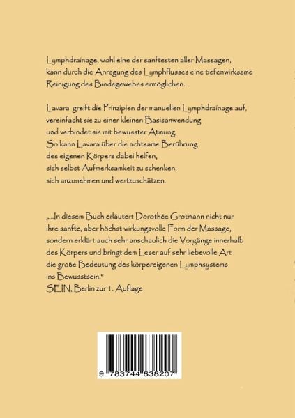 Lymphdrainage, wohl eine der sanftesten aller Massagen, kann durch die Anregung des Lymphflusses eine tiefenwirksame Reinigung des Bindegewebes ermöglichen.Lavara greift die Prinzipien der manuellen Lymphdrainage auf, vereinfacht sie zu einer kleinen Basisanwendung und verbindet sie mit bewusster Atmung. So kann Lavara über die achtsame Berührung des eigenen Körpers dabei helfen, sich selbst Aufmerksamkeit zu schenken, sich anzunehmen und wertzuschätzen."In diesem Buch erläutert Dorothée Grotmann nicht nur ihre sanfte, aber höchst wirkungsvolle Form der Massage, sondern erklärt auch sehr anschaulich die Vorgänge innerhalb des Körpers und bringt dem Leser auf sehr liebevolle Art die große Bedeutung des körpereigenen Lymphsystems ins Bewusstsein."SEIN, Berlin zur 1. Auflage