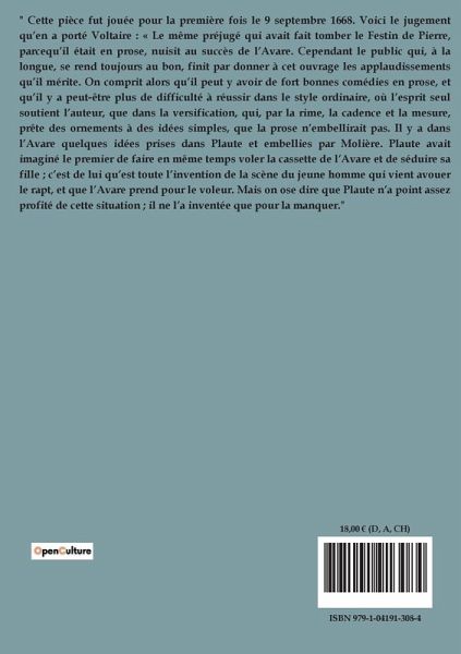 "L'Avare" de Molière est une comédie en cinq actes qui explore les conséquences de l'obsession maladive pour l'argent à travers le personnage principal, Harpagon. Harpagon est un vieil homme avare dont la vie est entièrement dominée par sa passion pour l'accumulation de richesses. Sa cupidité affecte non seulement sa propre existence, mais aussi celle de ses enfants, Cléante et Élise, qu'il tente de marier à des partenaires avantageux pour éviter de dépenser sa propre fortune. Cléante est amoureux de Marianne, une jeune femme sans dot, tandis qu'Élise aime Valère, un jeune homme sans fortune. Les intrigues se multiplient lorsque Harpagon lui-même envisage d'épouser Marianne, ignorant les sentiments de son fils. La pièce met en scène une série de quiproquos et de stratagèmes comiques, puis lorsque Cléante emprunte de l'argent à un usurier, qui se révèle être son propre père. Le point culminant de la comédie survient lorsque la cassette d'or de Harpagon est volée, le plongeant dans une frénésie de désespoir. Finalement, grâce à l'intervention de Valère, qui se révèle être de noble naissance, et à la découverte de la véritable identité de Marianne, les jeunes amants sont réunis et Harpagon récupère sa précieuse cassette. La pièce se termine sur une note de réconciliation, bien que l'avarice d'Harpagon reste inchangée.