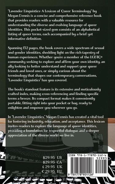 "Lavender Linguistics: A Lexicon of Queer Terminology" by Megan Dennis is a concise and comprehensive reference book that provides readers with a valuable resource for understanding the diverse and evolving language of queer identities. This pocket-sized gem consists of an alphabetical listing of queer terms, each accompanied by a brief yet informative definition. Spanning 152 pages, the book covers a wide spectrum of sexual and gender identities, shedding light on the rich tapestry of human experiences. Whether you're a member of the LGBTQ+ community seeking to explore and affirm your own…mehr