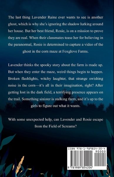 Something is lurking in Lavender's local corn maze. But if it isn't a ghost, what else could it be? The last thing Lavender Raine wants to see is another ghost, so when her best friend Rosie drags her to a haunted corn maze, she's less than thrilled. Lavender thinks the spooky story about the farm is fake. But when they enter the maze, weird things begin to happen. Broken flashlights, witchy laughter, that strange swishing noise in the corn-it's all in their imaginations, right? After getting lost in the dark field, a terrifying presence appears on the trail. Something sinister is stalking them, and it's up to the girls to figure out what it wants. With some unexpected help, can Lavender and Rosie escape from the Field of Screams? ¿ Ages 8-12 ¿ Chapter Book ¿ Good for Short Attention Spans ¿ Funny ¿ Paranormal ¿ Similar scare level to a Goosebumps book