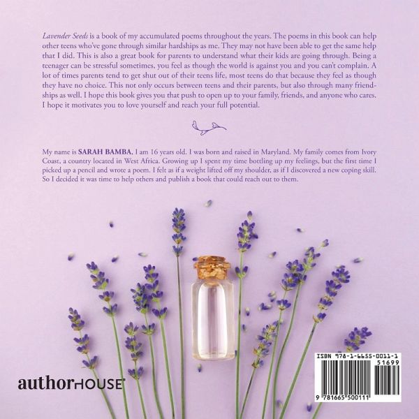 Lavender Seeds is a book of my accumulated poems throughout the years. The poems in this book can help other teens who've gone through similar hardships as me. They may not have been able to get the same help that I did. This is also a great book for parents to understand what their kids are going through. Being a teenager can be stressful sometimes, you feel as though the world is against you and you can't complain. A lot of times parents tend to get shut out of their teens life, most teens do that because they feel as though they have no choice. This not only occurs between teens and their parents, but also through many friendships as well. I hope this book gives you that push to open up to your family, friends, and anyone who cares. I hope it motivates you to love yourself and reach your full potential.