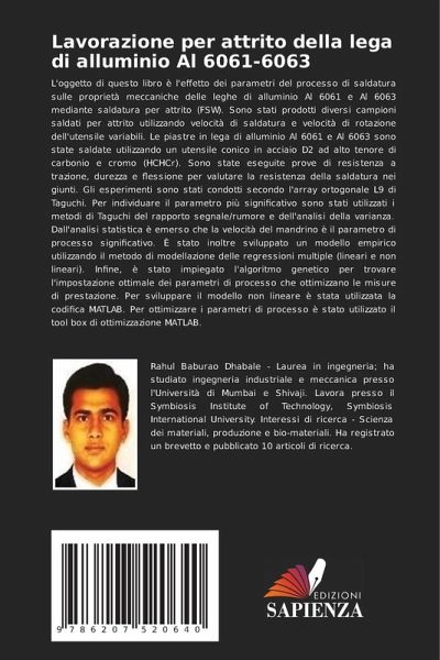 L'oggetto di questo libro è l'effetto dei parametri del processo di saldatura sulle proprietà meccaniche delle leghe di alluminio Al 6061 e Al 6063 mediante saldatura per attrito (FSW). Sono stati prodotti diversi campioni saldati per attrito utilizzando velocità di saldatura e velocità di rotazione dell'utensile variabili. Le piastre in lega di alluminio Al 6061 e Al 6063 sono state saldate utilizzando un utensile conico in acciaio D2 ad alto tenore di carbonio e cromo (HCHCr). Sono state eseguite prove di resistenza a trazione, durezza e flessione per valutare la resistenza della saldatura nei giunti. Gli esperimenti sono stati condotti secondo l'array ortogonale L9 di Taguchi. Per individuare il parametro più significativo sono stati utilizzati i metodi di Taguchi del rapporto segnale/rumore e dell'analisi della varianza. Dall'analisi statistica è emerso che la velocità del mandrino è il parametro di processo significativo. È stato inoltre sviluppato un modello empirico utilizzando il metodo di modellazione delle regressioni multiple (lineari e non lineari). Infine, è stato impiegato l'algoritmo genetico per trovare l'impostazione ottimale dei parametri di processo che ottimizzano le misure di prestazione. Per sviluppare il modello non lineare è stata utilizzata la codifica MATLAB. Per ottimizzare i parametri di processo è stato utilizzato il tool box di ottimizzazione MATLAB.
