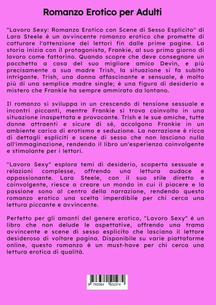 "Lavoro Sexy: Romanzo Erotico con Scene di Sesso Esplicito" di Lara Steele è un avvincente romanzo erotico che promette di catturare l'attenzione dei lettori fin dalle prime pagine. La storia inizia con il protagonista, Frankie, al suo primo giorno di lavoro come fattorino. Quando scopre che deve consegnare un pacchetto a casa del suo migliore amico Devin, e più precisamente a sua madre Trish, la situazione si fa subito intrigante. Trish, una donna affascinante e sensuale, è molto più di una semplice madre single; è una figura di desiderio e mistero che Frankie ha sempre ammirato da lontano.Il romanzo si sviluppa in un crescendo di tensione sessuale e incontri piccanti, mentre Frankie si trova coinvolto in una situazione inaspettata e provocante. Trish e le sue amiche, tutte donne attraenti e sicure di sé, accolgono Frankie in un ambiente carico di erotismo e seduzione. La narrazione è ricca di dettagli espliciti e scene di sesso che non lasciano nulla all'immaginazione, rendendoil libro un'esperienza coinvolgente e stimolante per i lettori."Lavoro Sexy" esplora temi di desiderio, scoperta sessuale e relazioni complesse, offrendo una lettura audace e appassionante. Lara Steele, con il suo stile diretto e coinvolgente, riesce a creare un mondo in cui il piacere e la passione sono al centro della narrazione, rendendo questo romanzo erotico una scelta imperdibile per chi cerca una lettura piccante e avvincente.Perfetto per gli amanti del genere erotico, "Lavoro Sexy" è un libro che non delude le aspettative, offrendo una trama avvincente e scene di sesso esplicito che lasciano il lettore desideroso di voltare pagina. Disponibile su varie piattaforme online, questo romanzo è un must-have per chi cerca una lettura erotica di qualità.