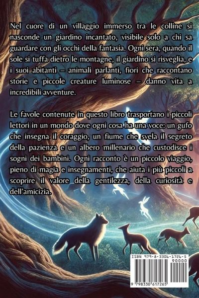 Nel cuore di un villaggio immerso tra le colline si nasconde un giardino incantato, visibile solo a chi sa guardare con gli occhi della fantasia. Ogni sera, quando il sole si tuffa dietro le montagne, il giardino si risveglia, e i suoi abitanti - animali parlanti, fiori che raccontano storie e piccole creature luminose - danno vita a incredibili avventure. Le favole contenute in questo libro trasportano i piccoli lettori in un mondo dove ogni cosa ha una voce: un gufo che insegna il coraggio, un fiume che svela il segreto della pazienza e un albero millenario che custodisce i sogni dei bambini. Ogni racconto è un piccolo viaggio, pieno di magia e insegnamenti, che aiuta i più piccoli a scoprire il valore della gentilezza, della curiosità e dell'amicizia.
