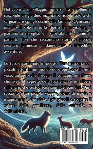 Nel cuore di un villaggio immerso tra le colline si nasconde un giardino incantato, visibile solo a chi sa guardare con gli occhi della fantasia. Ogni sera, quando il sole si tuffa dietro le montagne, il giardino si risveglia, e i suoi abitanti - animali parlanti, fiori che raccontano storie e piccole creature luminose - danno vita a incredibili avventure. Le favole contenute in questo libro trasportano i piccoli lettori in un mondo dove ogni cosa ha una voce: un gufo che insegna il coraggio, un fiume che svela il segreto della pazienza e un albero millenario che custodisce i sogni dei bambini. Ogni racconto è un piccolo viaggio, pieno di magia e insegnamenti, che aiuta i più piccoli a scoprire il valore della gentilezza, della curiosità e dell'amicizia.