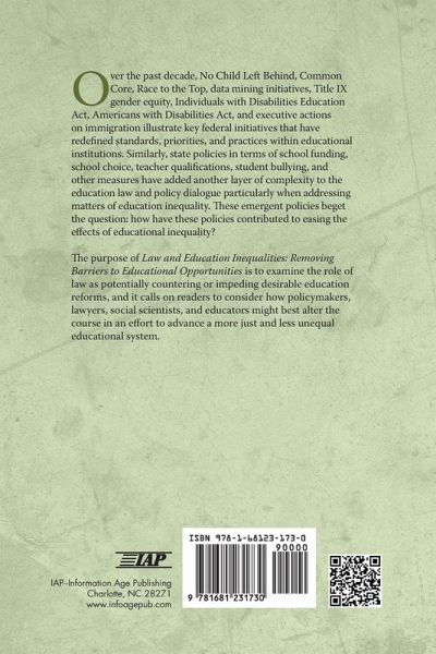 A volume in Law & Education series Series Editors: Jeffrey C. Sun, University of Louisville and Susan C. Bon, University of South Carolina Policies intended to shape student achievement and access at schools and colleges have changed significantly over the past decade. No Child Left Behind, Common Core, Race to the Top, data mining initiatives, Title IX gender equity, Individuals with Disabilities Education Act, Americans with Disabilities Act, and executive actions on immigration illustrate key federal initiatives that have redefined standards, priorities, and practices within educational institutions. Similarly, state policies in terms of school funding, school choice, teacher qualifications, student bullying, and other measures have added another layer of complexity to the education law and policy dialogue particularly when addressing matters of education inequality. These emergent policies beget the question: how have these policies contributed to easing the effects of educational inequality? The purpose of this book is to examine the role of law as potentially countering or impeding desirable education reforms, and it calls on readers to consider how policymakers, lawyers, social scientists, and educators might best alter the course in an effort to advance a more just and less unequal educational system.