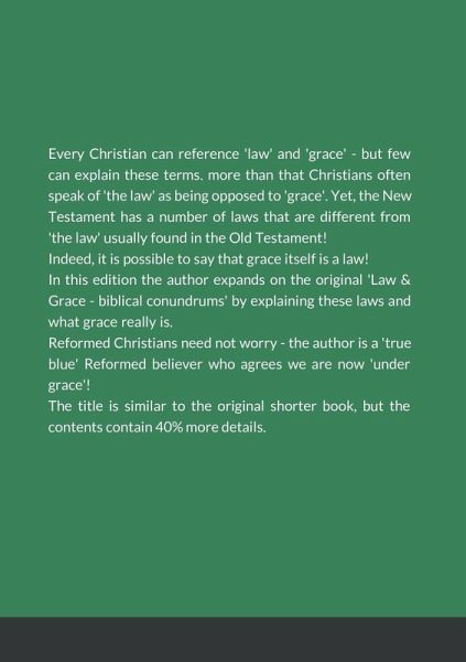 The author already has about 40 books published (including e-books). This book is an enlarged version of the first book with the same title. It has been expanded to include many explanatory notes. The cover has been changed to be a plain green, so as to differentiate the first and second editions. The aim is to describe the various laws in the New Testament. This is necessary because many Christians believe once they are 'under grace' the law no longer exists.