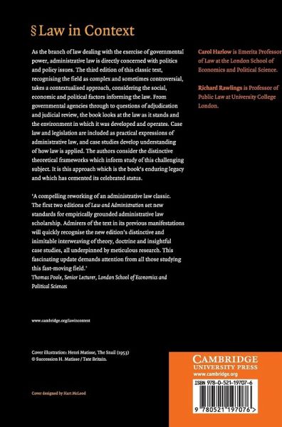 This definitive textbook explores the field of law which allows government and its agencies to practically apply its laws. The subject, affected by policy and political factors, can challenge even the more advanced student. In response, this title looks at both the law and the factors informing it, laying down the foundations of the subject. This contextualised approach also allows the student to develop the broadest possible perspective. Case law and legislation are set out and discussed, and the authors have built in a range of case studies to give a practical emphasis to the study. It is, however, the distinctive theoretical framework for administrative law that the authors develop that distinguishes this title from others and allows for real understanding of the subject. This updated edition will cement the title's seminal status.