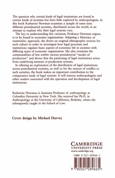 The question why certain kinds of legal institutions are found in certain kinds of societies has been little explored by anthropologists. In this book Katherine Newman examines a sample of some sixty different preindustrial societies, distributed across the world, in an attempt to explain why their legal systems vary. The key to understanding this variation, Professor Newman argues, is to be found in economic organization. Adopting a Marxian, or materialist, approach, she draws on original ethnographic sources for each culture in order to investigate how legal processes and institutions regulate basic aspects of economic life in societies with differing types of economic organization. She also examines the commonalities of law within various preindustrial 'modes of production' and shows that the patterning of legal institutions arises from underlying tensions in production systems. In offering an explanation of the distribution of legal institutions across preindustrial societies, as well as for the sources of conflict in such societies, the book makes an important contribution to the comparative study of legal systems. It will interest anthropologists and other readers concerned with the operation and development of legal institutions.