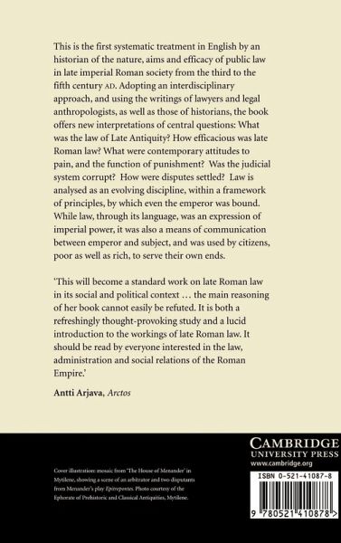 This is the first systematic treatment in English by an historian of the nature, aims and efficacy of public law in late imperial Roman society from the third to the fifth century AD. Adopting an interdisciplinary approach, and using the writings of lawyers and legal anthropologists, as well as those of historians, the book offers new interpretations of central questions: What was the law of late antiquity? How efficacious was late Roman law? What were contemporary attitudes to pain, and the function of punishment? Was the judicial system corrupt? How were disputes settled? Law is analysed as an evolving discipline, within a framework of principles by which even the emperor was bound. While law, through its language, was an expression of imperial power, it was also a means of communication between emperor and subject, and was used by citizens, poor as well as rich, to serve their own ends.