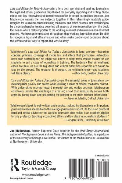 Law and Ethics for Today's Journalist offers aspiring and working journalists the practical understanding of law and ethics they must have to succeed at their craft. Instead of covering every nuance of media law for diverse communications majors, Mathewson focuses exclusively on what's relevant for journalists. Even though media law and media ethics are closely linked together in daily journalistic practice, they are usually covered in separate volumes. Mathewson brings them together in a clear and colourful way that practicing journalists will find more useful. Everything a journalist needs to know about legal protections, limitations, and risks inherent in workaday reporting is illustrated with highlights from major court opinions. Mathewson advises journalists who must often make ethical decisions on the spot with no time for the elaborate, multi-faceted analysis. The book assigns to journalists the hard decisions on ethical questions such as whether to go undercover or otherwise misrepresent themselves in order to get a big story. The ethics chapter precedes the law chapters because ethical standards should underlie a journalist's work at all times. There may be occasions when ethics and law are not parallel, thus calling for the journalist to make a personal judgment. Law and Ethics for Today's Journalist is user-friendly, written in clear, direct, understandable language on issues that really matter to a working journalist. Supplementary reading of the actual court cases is recommended and links to most cases are provided in the text. The text includes a fine (but purposely not exhaustive) bibliography listing important and useful legal cases, including instructive appellate and trial court opinions, state as well as federal.
