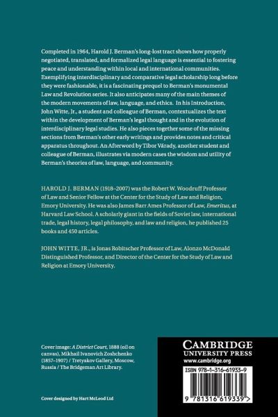 Completed in 1964, Harold J. Berman's long-lost tract shows how properly negotiated, translated and formalised legal language is essential to fostering peace and understanding within local and international communities. Exemplifying interdisciplinary and comparative legal scholarship long before they were fashionable, it is a fascinating prequel to Berman's monumental Law and Revolution series. It also anticipates many of the main themes of the modern movements of law, language and ethics. In his Introduction, John Witte, Jr, a student and colleague of Berman, contextualises the text within the development of Berman's legal thought and in the evolution of interdisciplinary legal studies. He has also pieced together some of the missing sections from Berman's other early writings and provided notes and critical apparatus throughout. An Afterword by Tibor Várady, another student and colleague of Berman, illustrates via modern cases the wisdom and utility of Berman's theories of law, language and community.