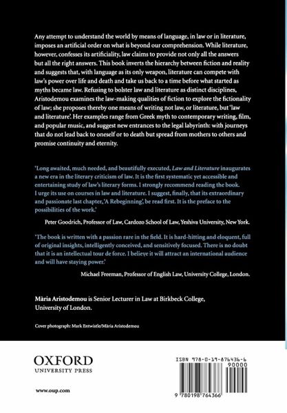 Any attempt to understand the world by means of language, in law or in literature, imposes an artificial order on what is beyond our comprehension. However, whilst literature admits its own artificiality, law insists that it provides not only all the answers but all the right answers. Using examples ranging from Greek myth to contemporary writing, film and popular music, Aristodemou works from the assumption that not just literature but also law are fictions, and she suggests ways in which literature can help us understand better the mythic origins of law. In doing so she shows how we can learn from the law-making qualities of literature new ways of addressing and living with the fictionality of law.