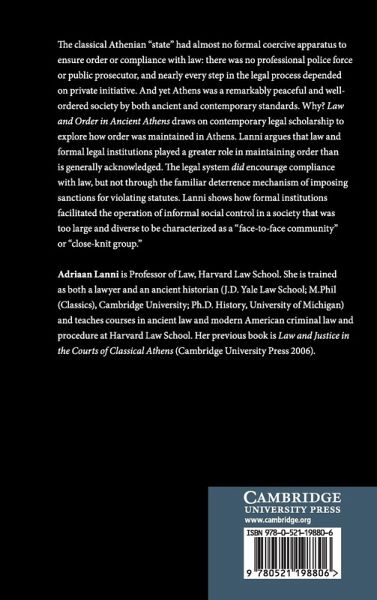 The classical Athenian 'state' had almost no formal coercive apparatus to ensure order or compliance with law: there was no professional police force or public prosecutor, and nearly every step in the legal process depended on private initiative. And yet Athens was a remarkably peaceful and well-ordered society by both ancient and contemporary standards. Why? Law and Order in Ancient Athens draws on contemporary legal scholarship to explore how order was maintained in Athens. Lanni argues that law and formal legal institutions played a greater role in maintaining order than is generally acknowledged. The legal system did encourage compliance with law, but not through the familiar deterrence mechanism of imposing sanctions for violating statutes. Lanni shows how formal institutions facilitated the operation of informal social control in a society that was too large and diverse to be characterized as a 'face-to-face community' or 'close-knit group'.