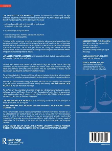 Provides a framework for understanding of the legal, contractual and procedural implication of architectural practice. The book acts as a useful aide-memoire for students and practitioners based on the premise that smooth legal administration will provide the conditions under which client relations can be constructive and good design can be achieved.