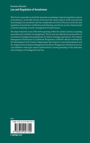 This book encapsulates in detail the principles pertaining to legal and regulatory aspects of aerodromes. As the title denotes, it discusses the various aspects of the structure and functioning of an aerodrome and the complexities involved. It focuses on the law and regulation of aerodrome certification and planning, aerodrome services, financial and economic planning, security, management and governance.