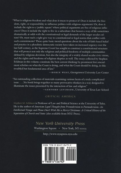 Few issues arouse as much passionate debate as the relationship between church and state. Political parties and coalitions have long jockeyed for position in the battle to either keep the two separate, or to unify them in one nation indivisible from God. While the battle has been raging in the political arena, figures from academia, the media, and myriad other vantage points, have commented on the context and constitutionality of laws governing religious expression. In Law and Religion, Stephen M. Feldman brings together the many perspectives that have shaped policy on this important national issue. In giving voice to the political left and right, as well as to cultural, philosophical, sociological and historical perspectives, the book serves as an even-handed treatment of an issue all too often clouded by biases. Contributors ranging from Stanley Fish to Richard John Neuhaus explore issues extending from religious morality and religious freedom, to fundamentalism, the separation of church and state, religion and public schooling, and liberal political theory. Comprehensive in scope, Law and Religion will stand as an important reference for anyone seeking to further understand this complex and highly emotional topic.