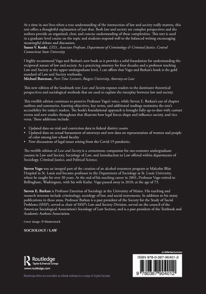 This new edition of¿the landmark text Law and Society¿exposes readers to the dominant theoretical perspectives and sociological methods that are used to explain the interplay between law and society. This twelfth edition continues to preserve Professor Vago's voice, while Steven E. Barkan's use of chapter outlines and summaries, learning objectives, key terms, and additional readings maintains the text's accessibility for today's readers. The book's foundational approach is brought fully up-to-date with current events and new studies throughout that illustrate how legal forces shape and influence society, and vice versa.¿ These additions include: Updated data on trial and conviction data in federal district courts Updated data on sexual harassment of attorneys and new data on representation of women and people of color among law school faculty New discussions of legal issues arising from the Covid-19 pandemic. The twelfth edition of¿Law and Society¿is¿äcornerstone¿companion¿for one-semester undergraduate courses in Law and Society, Sociology of Law,¿and¿Introduction to Law offered within departments of Sociology, Criminal Justice, and Political Science.