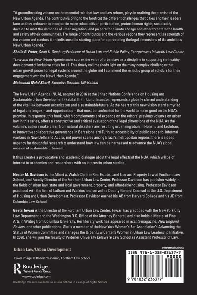 A groundbreaking volume on the essential role that law, and law reform, plays in realizing the promise of the New Urban Agenda. The contributors bring to the forefront the different challenges that cities and their leaders face as they endeavor to incorporate more robust citizen participation, protect human rights, sustainably develop to meet the demands of urban migration, and prepare for climate change and other threats to the health and safety of their communities. The range of contributors and the various regions they represent is a strength of the volume and renders it an indispensable starting place for appreciating the legal dimensions of the ambitious New Urban Agenda.