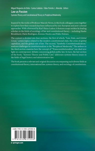 The content is divided into four sections, the first of which, "Law, State, and Global Crisis," covers topics related to the modern constitutional state, the crisis of global capitalism, and the global rule of law. The second, "Symbolic Constitutionalization," analyzes challenges to constitutionalism in the "Peripheral Modernity." The authors in the third section examine how the concept of "Transconstitutionalism" can shed new light on contemporary debates concerning global public law. In turn, the last section of the book, "Systems Theory and Public Law," addresses systems theory issues in the fields of legal history and administrative law.