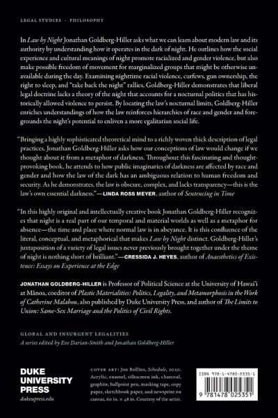 In Law by Night Jonathan Goldberg-Hiller asks what we can learn about modern law and its authority by understanding how it operates in the dark of night. He outlines how the social experience and cultural meanings of night promote racialized and gender violence, but also make possible freedom of movement for marginalized groups that might be otherwise unavailable during the day. Examining nighttime racial violence, curfews, gun ownership, the right to sleep, and “take back the night” rallies, Goldberg-Hiller demonstrates that liberal legal doctrine lacks a theory of the night that accounts for a nocturnal politics that has historically allowed violence to persist. By locating the law’s nocturnal limits, Goldberg-Hiller enriches understandings of how the law reinforces hierarchies of race and gender and foregrounds the night’s potential to enliven a more egalitarian social life.