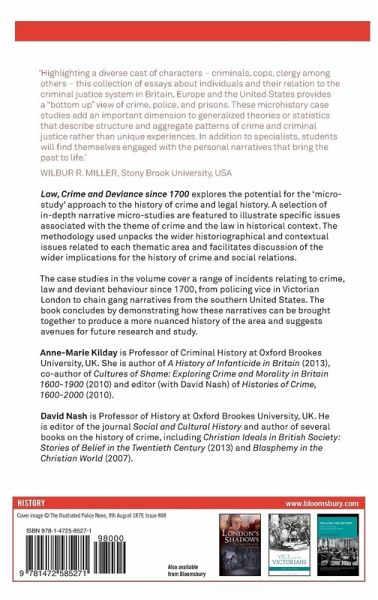 CHOICE Outstanding Academic Title 2017 Law, Crime and Deviance since 1700 explores the potential for the 'micro-study' approach to the history of crime and legal history. A selection of in-depth narrative micro-studies are featured to illustrate specific issues associated with the theme of crime and the law in historical context. The methodology used unpacks the wider historiographical and contextual issues related to each thematic area and facilitates discussion of the wider implications for the history of crime and social relations. The case studies in the volume cover a range of incidents relating to crime, law and deviant behaviour since 1700, from policing vice in Victorian London to chain gang narratives from the southern United States. The book concludes by demonstrating how these narratives can be brought together to produce a more nuanced history of the area and suggests avenues for future research and study.