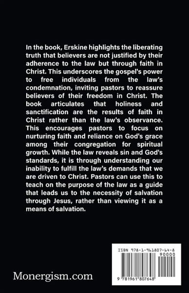 THE DEATH OF LEGAL RIGHTEOUSNESS, THE LIFE OF GOSPEL HOLINESS: "I through the law, am dead to the law, that I might live unto God." Galatians 2:19. Ralph Erskine's "Law-Death, Gospel-Life" presents a profound exploration of the Christian believer's transition from being bound by the law to living in the freedom offered through the gospel. Erskine uses the Apostle Paul's teachings to argue that true sanctification and holiness are attainable not through adherence to the law, which he posits as an instrument of death, but through faith in Christ, which brings life. This theological treatise considers the intricate relationship between law and grace, emphasizing the inadequacy of the law to produce righteousness and the necessity of dying to the law to truly live unto God. In the book, Erskine highlights the liberating truth that believers are not justified by their adherence to the law but through faith in Christ. This underscores the gospel's power to free individuals from the law's condemnation, inviting pastors to reassure believers of their freedom in Christ. The book articulates that holiness and sanctification are the results of faith in Christ rather than the law's observance. This encourages pastors to focus on nurturing faith and reliance on God's grace among their congregation for spiritual growth. While the law reveals sin and God's standards, it is through understanding our inability to fulfill the law's demands that we are driven to Christ. Pastors can use this to teach on the purpose of the law as a guide that leads us to the necessity of salvation through Jesus, rather than viewing it as a means of salvation.
