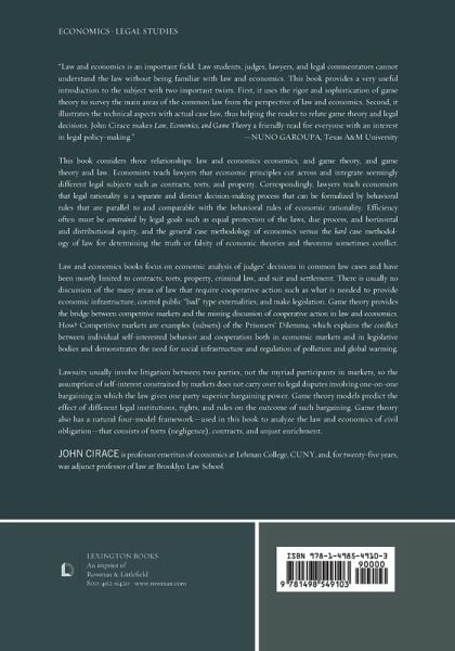 This book considers three relationships: law and economics; economics and game theory; and game theory and law. Economists teach lawyers that economic principles cut across and integrate seemingly different legal subjects such as contracts, torts, and property. Correspondingly, lawyers teach economists that legal rationality is a separate and distinct decision-making process that can be formalized by behavioral rules that are parallel to and comparable with the behavioral rules of economic rationality, that efficiency often must be constrained by legal goals such as equal protection of the laws, due process, and horizontal and distributional equity, and that the general case methodology of economics vs. the hard case methodology of law for determining the truth or falsity of economic theories and theorems sometimes conflict. Economics and Game Theory: Law and economics books focus on economic analysis of judges' decisions in common law cases and have been mostly limited to contracts, torts, property, criminal law, and suit and settlement. There is usually no discussion of the many areas of law that require cooperative action such as is needed to provide economic infrastructure, control public "bad" type externalities, and make legislation. Game theory provides the bridge between competitive markets and the missing discussion of cooperative action in law and economics. How? Competitive markets are examples (subset) of the Prisoners' Dilemma, which explains the conflict between individual self-interested behavior and cooperation both in economic markets and in legislative bodies and demonstrates the need for social infrastructure and regulation of pollution and global warming. Game Theory and Law: Lawsuits usually involve litigation between two parties, not the myriad participants in markets, so the assumption of self-interest constrained by markets does not carry over to legal disputes involving one-on-one bargaining in which the law gives one party superior bargaining power. Game theory models predict the effect of different legal institutions, rights, and rules on the outcome of such bargaining. Game theory also has a natural four-model framework which is used in this book to analyze the law and economics of civil obligation, which consists of torts (negligence), contracts, and unjust enrichment.