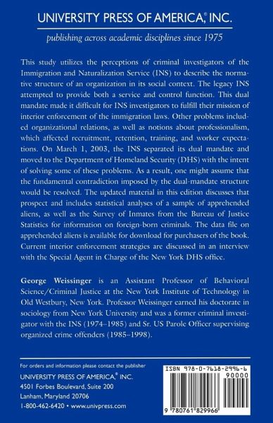 This study utilizes the perceptions of criminal investigators of the Immigration and Naturalization Service (INS) to describe the normative structure of an organization in its social context. The legacy INS attempted to provide both a service and control function. This dual mandate made it difficult for INS investigators to fulfill their mission of interior enforcement of the immigration laws. Other problems included organizational relations, as well as notions about professionalism, which affected recruitment, retention, training, and worker expectations. On March 1, 2003, the INS separated its dual mandate and moved to the Department of Homeland Security (DHS) with the intent of solving some of these problems. As a result, one might assume that the fundamental contradiction imposed by the dual-mandate structure would be resolved. The updated material in this edition discusses that prospect and includes statistical analyses of a sample of apprehended aliens, as well as the Survey of Inmates from the Bureau of Justice Statistics for information on foreign-born criminals. The data file on apprehended aliens is available for download for purchasers of the book. Current interior enforcement strategies are discussed in an interview with the Special Agent in Charge of the New York DHS office.