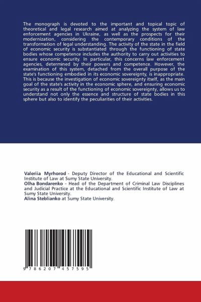 The monograph is devoted to the important and topical topic of theoretical and legal research aimed at analyzing the system of law enforcement agencies in Ukraine, as well as the prospects for their modernization, considering the contemporary conditions of the transformation of legal understanding. The activity of the state in the field of economic security is substantiated through the functioning of state bodies whose competence includes the authority to carry out activities to ensure economic security. In particular, this concerns law enforcement agencies, determined by their powers and competence. However, the examination of this system, detached from the overall purpose of the state's functioning embodied in its economic sovereignty, is inappropriate. This is because the investigation of economic sovereignty itself, as the main goal of the state's activity in the economic sphere, and ensuring economic security as a result of the functioning of economic sovereignty, allows us to understand not only the essence and structure of state bodies in this sphere but also to identify the peculiarities of their activities.