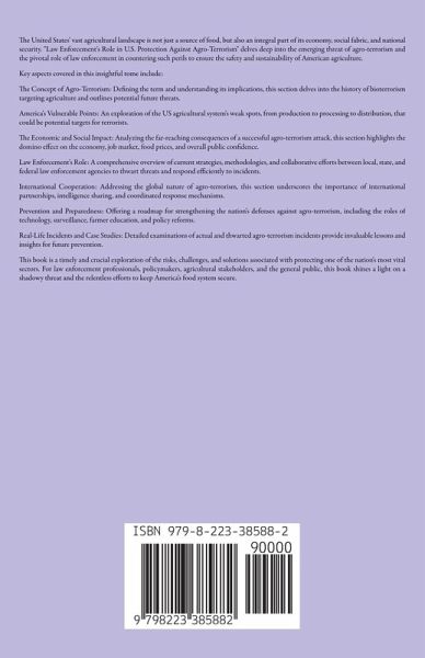 The United States' vast agricultural landscape is not just a source of food, but also an integral part of its economy, social fabric, and national security. "Securing America's Harvest" delves deep into the emerging threat of agro-terrorism and the pivotal role of law enforcement in countering such perils to ensure the safety and sustainability of American agriculture. Key aspects covered in this insightful tome include: The Concept of Agro-Terrorism: Defining the term and understanding its implications, this section delves into the history of bioterrorism targeting agriculture and outlines potential future threats. America's Vulnerable Points: An exploration of the US agricultural system's weak spots, from production to processing to distribution, that could be potential targets for terrorists. The Economic and Social Impact: Analyzing the far-reaching consequences of a successful agro-terrorism attack, this section highlights the domino effect on the economy, job market, food prices, and overall public confidence. Law Enforcement's Role: A comprehensive overview of current strategies, methodologies, and collaborative efforts between local, state, and federal law enforcement agencies to thwart threats and respond efficiently to incidents. International Cooperation: Addressing the global nature of agro-terrorism, this section underscores the importance of international partnerships, intelligence sharing, and coordinated response mechanisms. Prevention and Preparedness: Offering a roadmap for strengthening the nation's defenses against agro-terrorism, including the roles of technology, surveillance, farmer education, and policy reforms. Real-Life Incidents and Case Studies: Detailed examinations of actual and thwarted agro-terrorism incidents provide invaluable lessons and insights for future prevention. "Securing America's Harvest" is a timely and crucial exploration of the risks, challenges, and solutions associated with protecting one of the nation's most vital sectors. For law enforcement professionals, policymakers, agricultural stakeholders, and the general public, this book shines a light on a shadowy threat and the relentless efforts to keep America's food system secure.