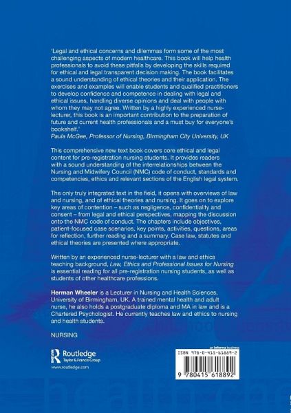This comprehensive new textbook covers core ethical and legal content for pre-registration nursing students. It provides readers with a sound understanding of the interrelationships between the NMC's code of conduct, standards and competencies, ethics and relevant sections of the English legal system. The only truly integrated text in the field, it opens with overviews of law and nursing, and ethical theories and nursing. It goes on to explore key areas of contention - such as negligence, confidentiality and consent - from legal and ethical perspectives, mapping the discussion onto the NMC code of conduct. The chapters include objectives, patient-focused case scenarios, key points, activities, questions, areas for reflection, further reading and a summary. Case law and statutes and ethical theories are presented where appropriate. Written by an experienced nurse-lecturer with a law and ethics teaching background, Law, Ethics and Professional Issues for Nursing is essential reading for all pre-registration nursing students, as well as students of other healthcare professions.