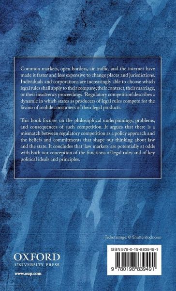 Common markets, open borders, air traffic, and the internet have made it faster and less expensive to change places and jurisdictions. As a result, legal forums are increasingly treated as a good that is subject to the market mechanism. Individuals and corporations increasingly have free reign to choose which legal rules to apply to their company, their contract, their marriage, or their insolvency proceedings. States in turn grant these opportunities and respond to demand by competing with other suppliers of legal regimes. 'Regulatory competition' describes a dynamic in which states as producers of legal rules compete for the favour of mobile consumers of their legal products. This book focuses on the philosophical underpinnings, problems, and consequences of such regulatory competition. It argues that there is a mismatch between regulatory competition as a policy approach and the beliefs and commitments that shape our thinking about law and the state. It concludes that 'law markets' are potentially at odds with both our conception of the functions of legal rules and of key political ideals and principles such as democracy, state autonomy, and political authority.